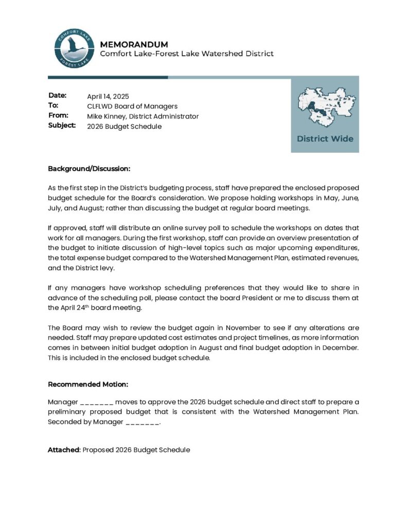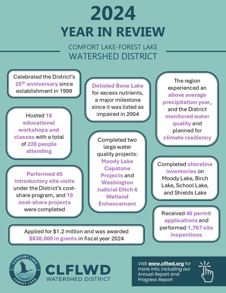 Summary of District activities in 2024 including administration, programs, projects, audit, budget, work plan.
