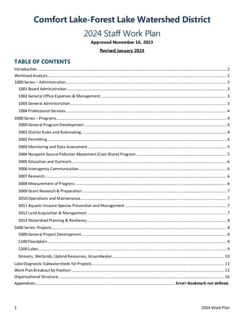 2024 CLFLWD Staff Work Plan. Approved by the Board of Managers at the November 16, 2023 regular board meeting. Revised January 2024 to include the names of two new staff members: Tori Philippi, Office Manager and Adam Hjelm, Education & Outreach Coordinator.