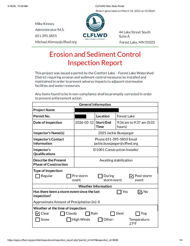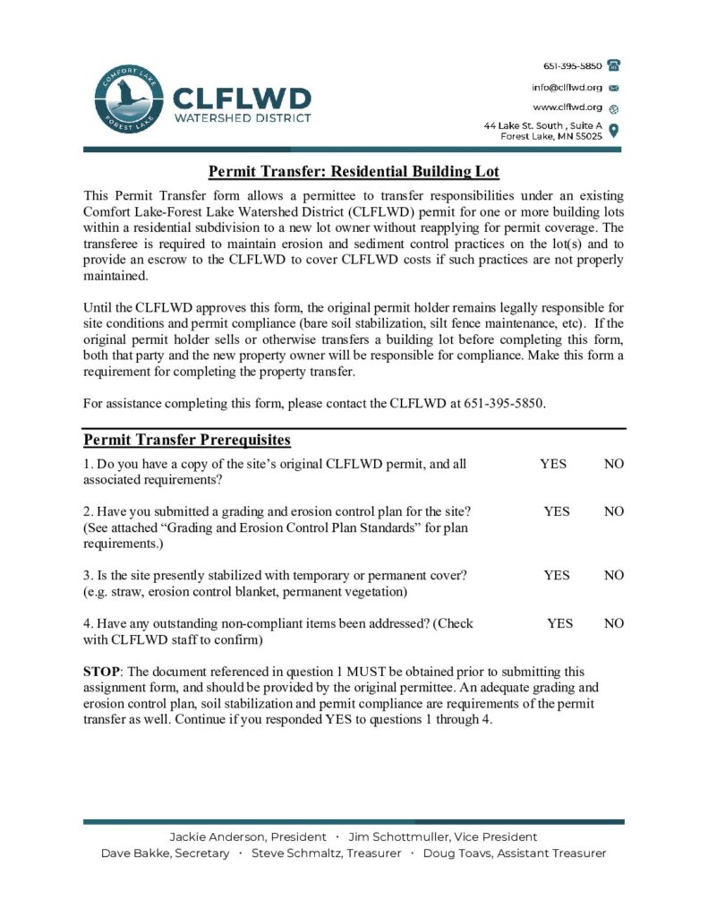 This Permit Transfer form allows a permittee to transfer responsibilities under an existing CLFLWD permit for all or a portion of a site to another party without reapplying for permit coverage.