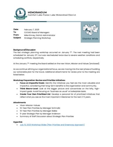 2025-02-11 Agenda Item 02 – Strategic Planning Workshop MemoBy Tori Philippi | February 7, 2025 Download File Type: pdf File Size: 144 KB Categories: Board Meetings Tags: District Wide, Memo