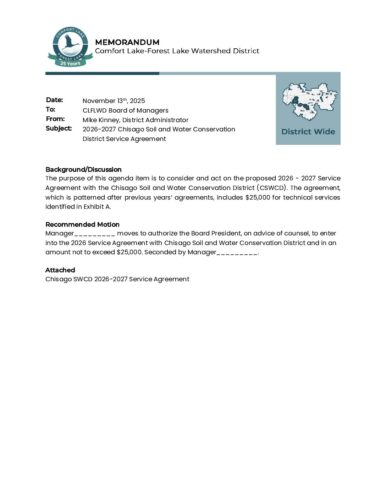 2025-11-20 Agenda Item 07b – 2026-2027 Chisago SWCD Service AgreementBy Tori Philippi | November 13, 2025 Download File Type: pdf File Size: 345 KB Categories: Board Meetings Tags: District Wide, Memo