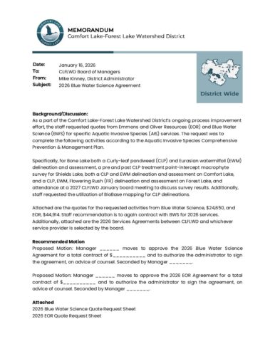 2026-01-22 Agenda Item 06b – 2026 Aquatic Plant Surveys Service AgreementBy Tori Philippi | January 20, 2026 Download File Type: pdf File Size: 954 KB Categories: Board Meetings Tags: District Wide, Memo