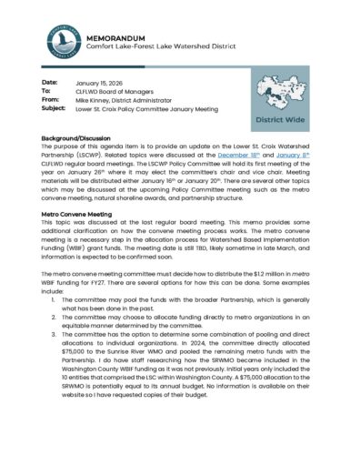 2026-01-22 Agenda Item 06c – Lower St. Croix Policy Committee January MeetingBy Tori Philippi | January 16, 2026 Download File Type: pdf File Size: 382 KB Categories: Board Meetings Tags: District Wide, Memo