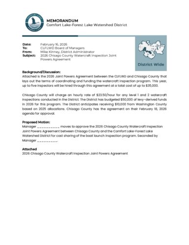 2026-02-26 Agenda Item 06b – 2026 Chisago County Watercraft Inspection Joint Powers AgreementBy Tori Philippi | February 19, 2026 Download File Type: pdf File Size: 315 KB Categories: Board Meetings Tags: District Wide, Memo