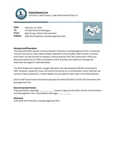 2026-03-12 Agenda Item 03a – 2026 Aquatic Invasive Species Prevention & Management PlanBy Tori Philippi | March 5, 2026 Download File Type: pdf File Size: 8 MB Categories: Board Meetings Tags: District Wide, Memo