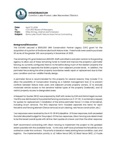 2026-04-23 Agenda Item 07d – Bone Lake South Nature Area Fence ContractingBy Tori Philippi | April 17, 2026 Download File Type: pdf File Size: 2 MB Categories: Board Meetings Tags: Bone LMD, Memo