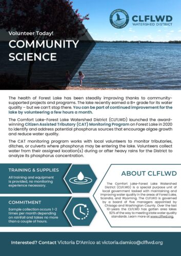 CAT Volunteer FlyerBy Tori Philippi | April 6, 2026 Download File Type: pdf File Size: 4 MB Categories: Monitoring & Data, Residential Resources Tags: Forest Lake, Forest LMD