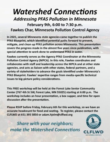 Watershed Connections: Addressing PFAS Pollution in Minnesota FlyerBy Tori Philippi | January 28, 2026 Download File Type: pdf File Size: 2 MB Categories: Education & Outreach Tags: District Wide