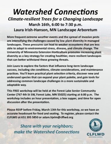 Watershed Connections: Climate-Resilient Trees for a Changing Landscape FlyerBy Tori Philippi | February 10, 2026 Download File Type: pdf File Size: 2 MB Categories: Education & Outreach Tags: District Wide